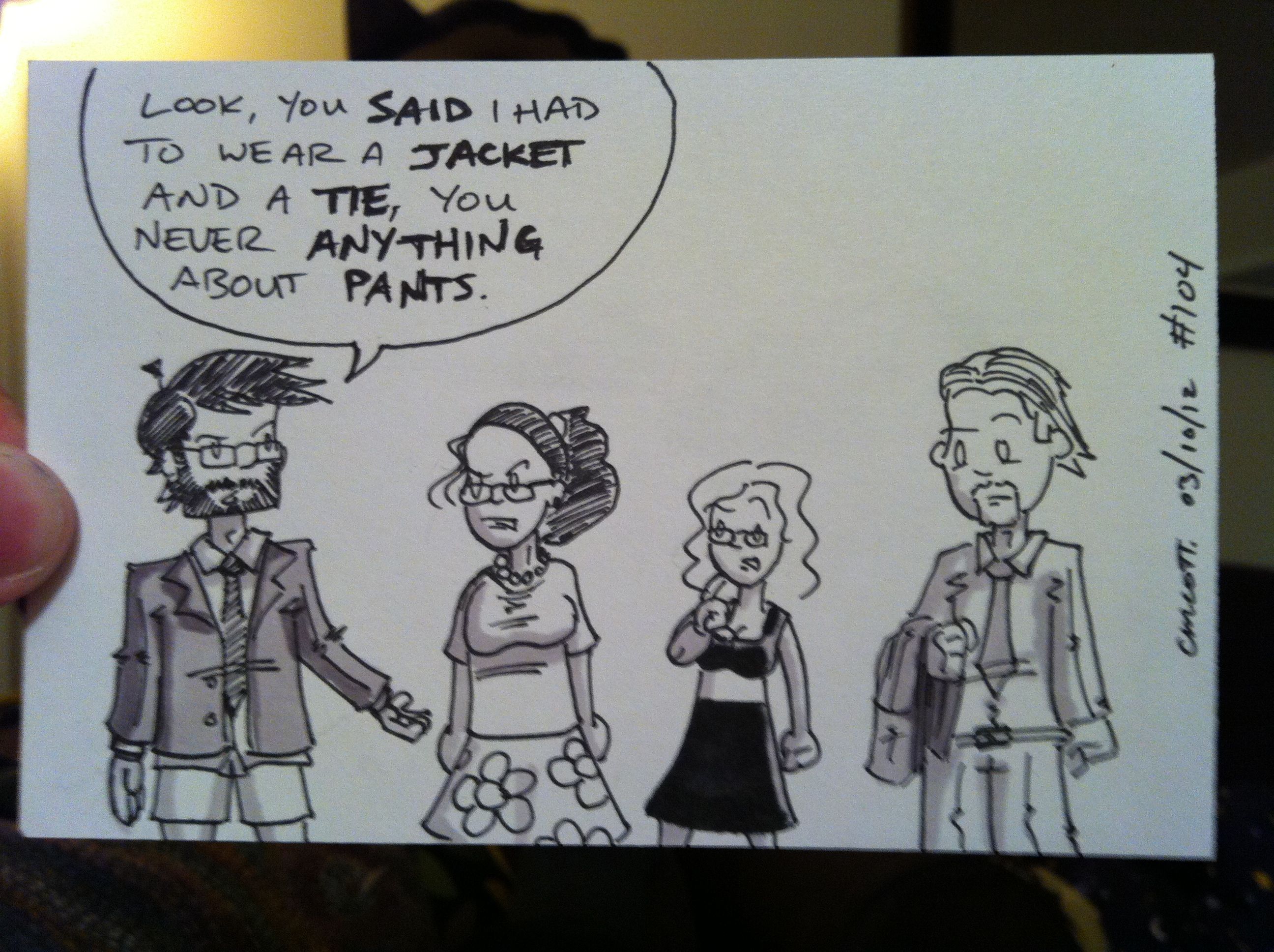 Look, I don’t like getting dressed up, okay? I hate ties. I’m okay with sports jackets and blazers and stuff, though. I do hate tucking in my shirt as well (nothing worse than seeing a cartoonist’s gut hang over his belt while he pigs out on steak and tiny little fried mac’n’cheese thingies). On the other hand, I love delicious dinners, and even if this one was in a fancy restaurant with a dress code and crap, the food was fantastic.