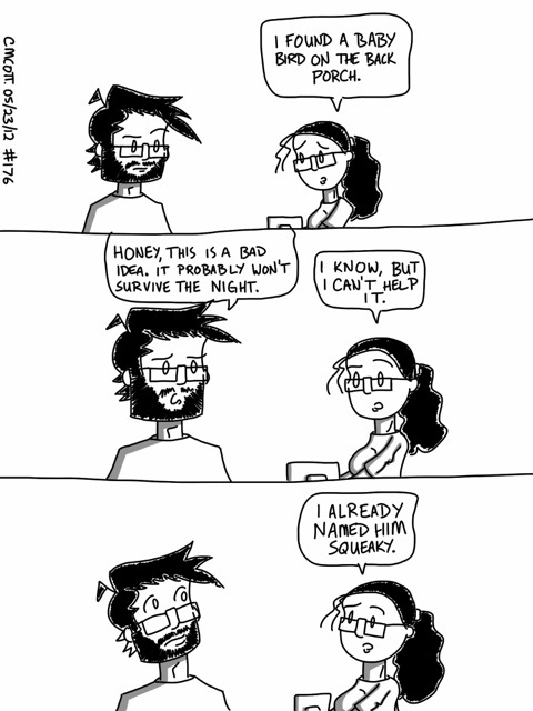 We found a baby bird on one of our patio chairs yesterday afternoon. It was clearly very young: its eyes still hadn’t even opened. The poor thing had clearly fallen out of a nest in one of the gutters above. I was surprised it survived the fall, and my wife insisted we try to save it. We put it in a box with a heating pad and fed it wet cat food. It managed to survive the night, but died when we were taking it with us to school this morning. Poor Squeaky died young, but I think we finally formed a truce with the birds in the neighborhood.