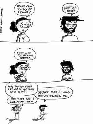 Sketch a Day, Day 223 July 9, 2012September 26, 2012 | xeyeti I’m pretty sure she’s trying to kill me. Or at least give me a concussion. Share this: Click to share on Tumblr (Opens in new window) Tumblr Click to share on X (Opens in new window) X Click to share on Facebook (Opens in new window) Facebook Like Loading... Related