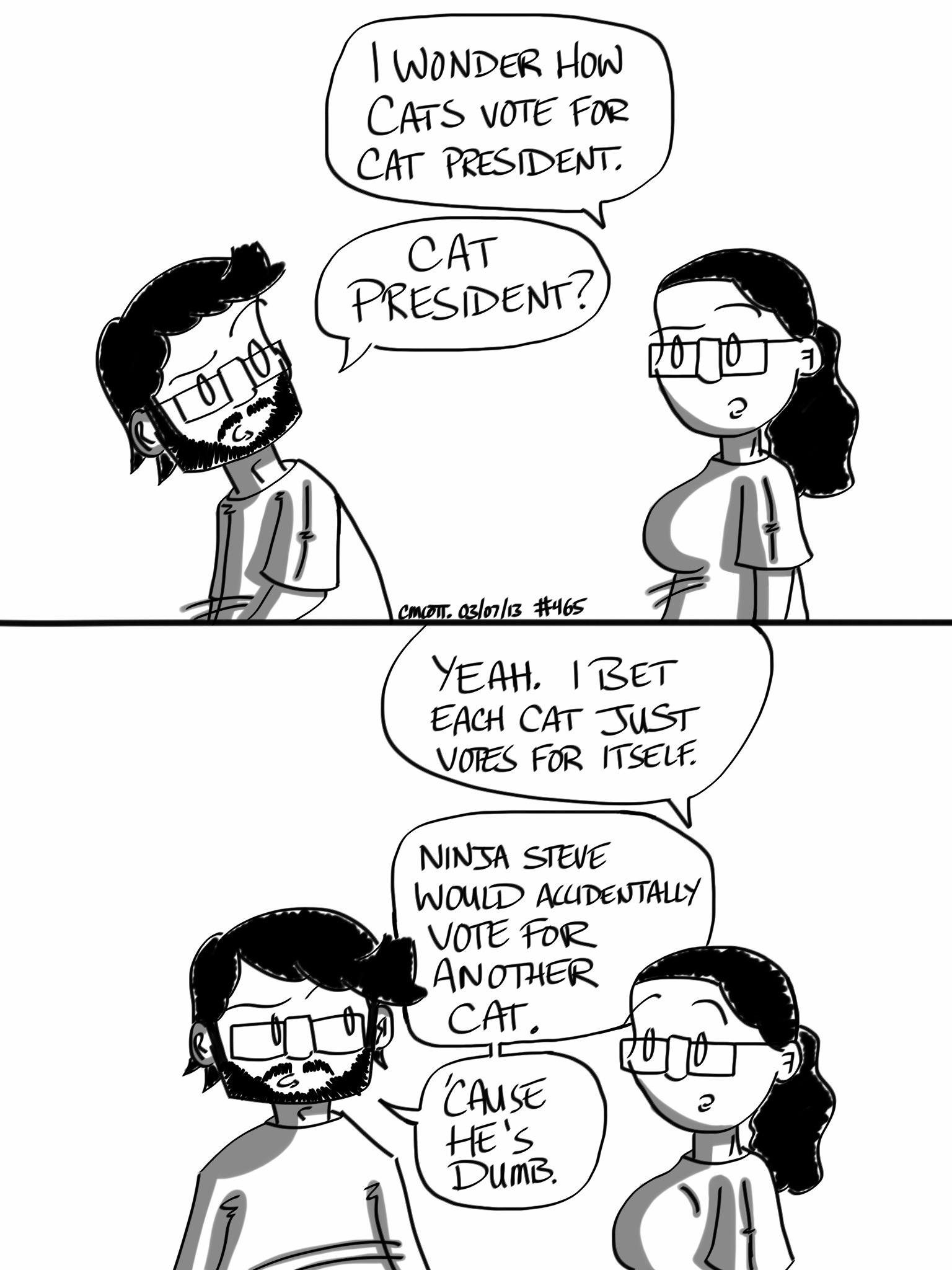 Sketch a Day, Day 465 March 7, 2013March 7, 2013 | xeyeti Really, how would cats elect the cat president? Share this: Click to share on Tumblr (Opens in new window) Tumblr Click to share on X (Opens in new window) X Click to share on Facebook (Opens in new window) Facebook Like Loading... Related