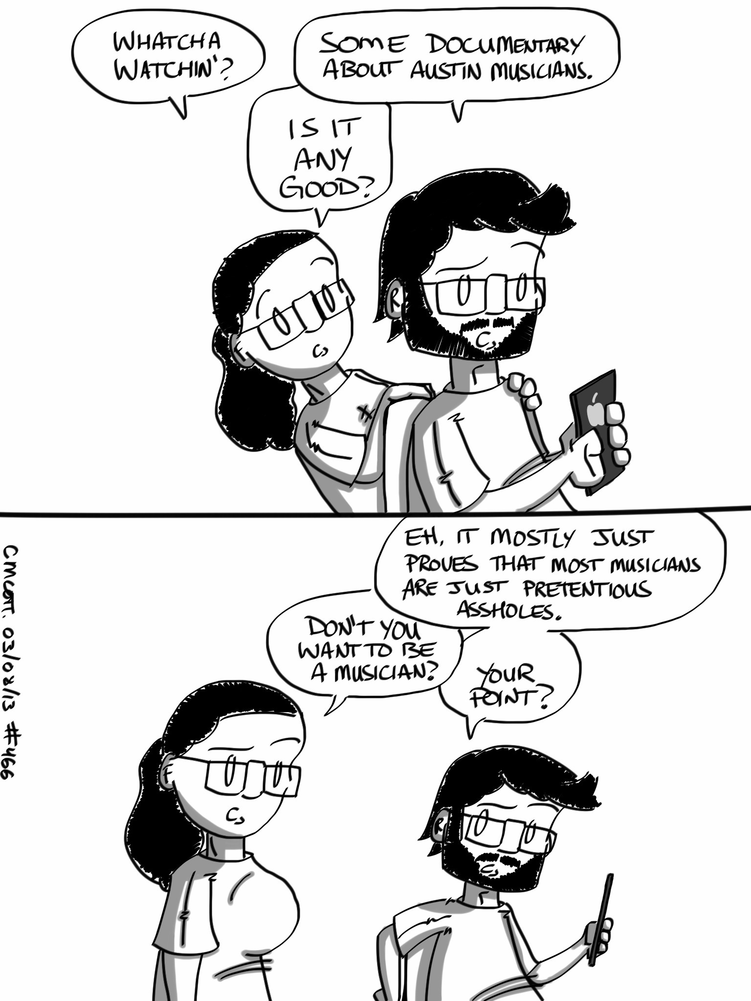 On my brother’s recommendation, I watched the movie Echotone this evening. It’s a strange documentary, examining a number of Austin musicians trying to “make it” on their own terms or create the music they want to or whatever. Most of them come across as too precious or twee or pretentious or whatever. It’s a weird movie, but probably worth watching if you’re a musician yourself.