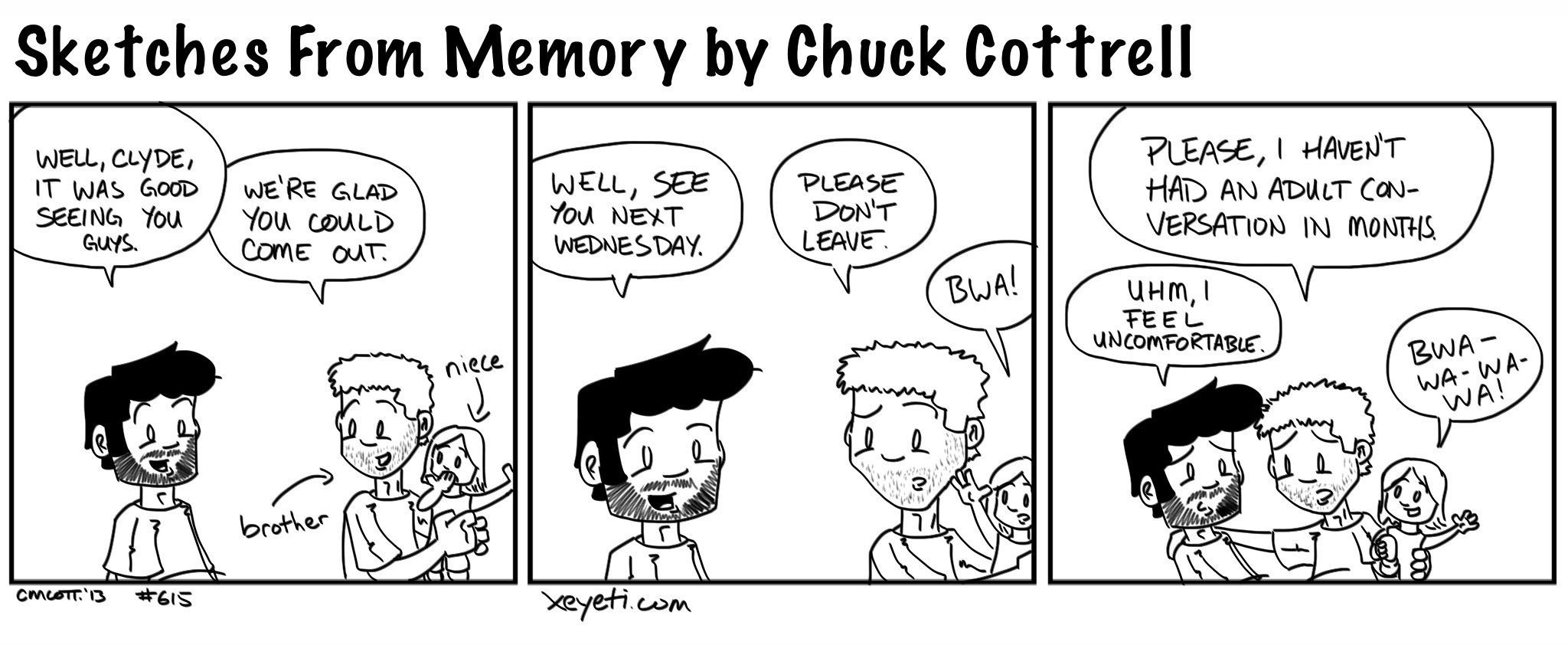 #615 – Adult Conversation August 13, 2013August 12, 2013 | xeyeti Been visiting we my brother and his wife and child up in Kansas City. It’s been fun, but I feel my brother is a little sad I’m leaving. It’s mostly just him, the kid, and the dog while his wife is at work. Share this: Click to share on Tumblr (Opens in new window) Tumblr Click to share on X (Opens in new window) X Click to share on Facebook (Opens in new window) Facebook Like Loading... Related