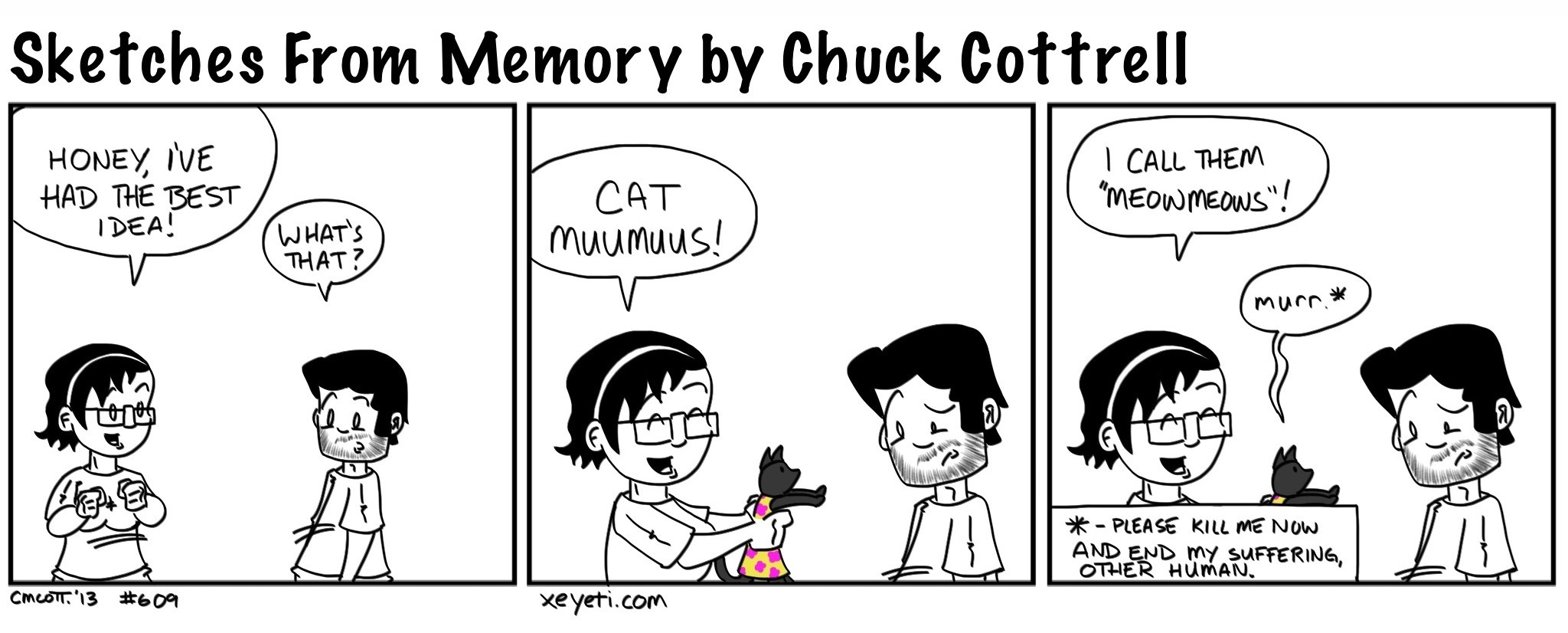 At the Wife’s birthday party Saturday night, so e friends suggested muumuus for cats. I immediately suggested “meowmeows,” which I’m pretty sure is a million dollar idea. Also, the term Meowmeows is now ™ and (c) me. So yeah.
