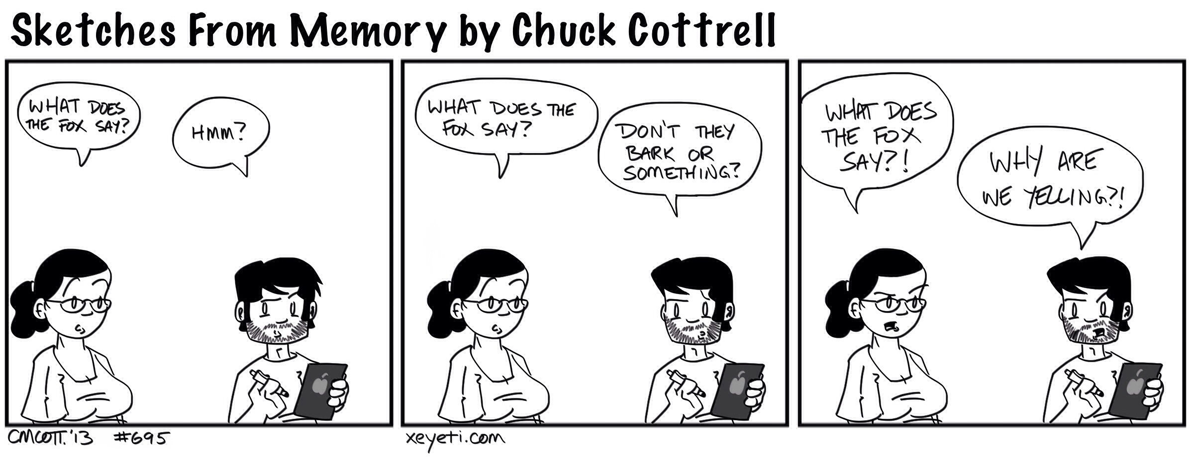 #695 – The Fox December 3, 2013December 2, 2013 | xeyeti I have heard reference to “What does the fox say?”, but have no idea what the hell it’s referring to. And I’m quite content in that ignorance. Share this: Click to share on Tumblr (Opens in new window) Tumblr Click to share on X (Opens in new window) X Click to share on Facebook (Opens in new window) Facebook Like Loading... Related