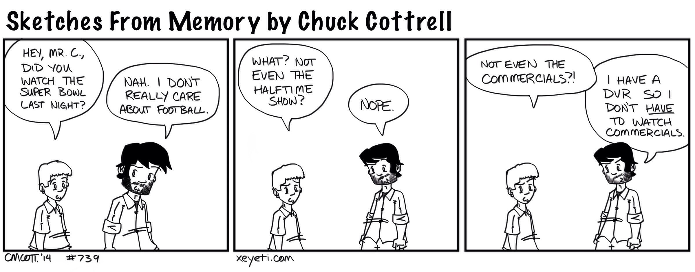 #739 – The Big Game February 3, 2014February 2, 2014 | xeyeti I don’t really care about football. Or commercials. Or Bruno Mars. So the whole evening was pretty well lost on me.