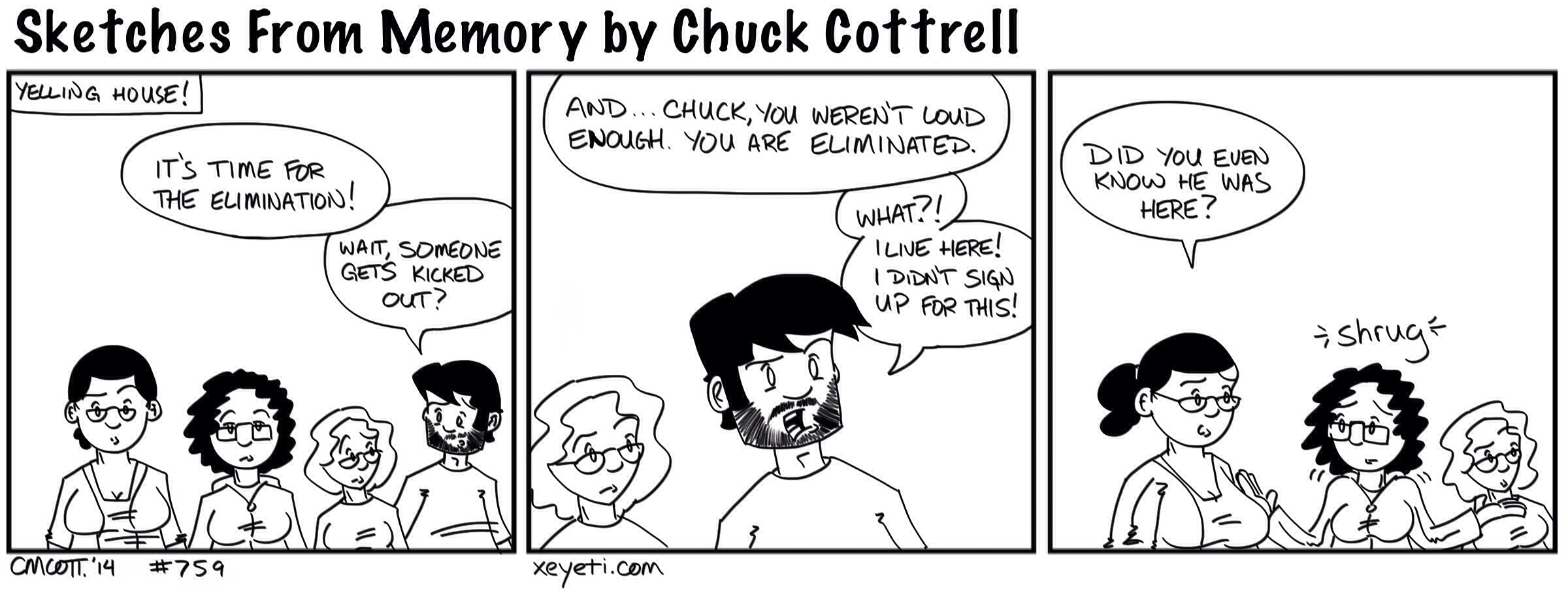 #759 : Yelling House: Elimination March 5, 2014March 5, 2014 | xeyeti My name is on the lease and everything, but I never even signed on for the gorram show. Share this: Click to share on Tumblr (Opens in new window) Tumblr Click to share on X (Opens in new window) X Click to share on Facebook (Opens in new window) Facebook Like Loading... Related