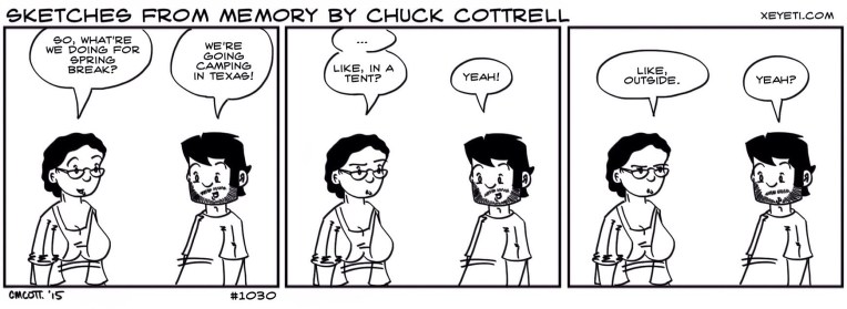 He Wife and I are in Texas camping with my family as we speak! She’s never been before, so it’s certain to be an experience for her. I assume we have not been eaten by bears.