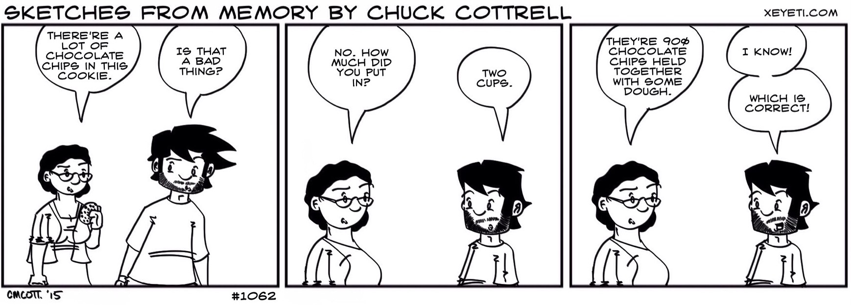 #1062 – 90% Chocolate Chip May 11, 2015 | xeyeti Twice the chocolate chips! Delicious. Share this: Click to share on Tumblr (Opens in new window) Tumblr Click to share on X (Opens in new window) X Click to share on Facebook (Opens in new window) Facebook Like Loading... Related