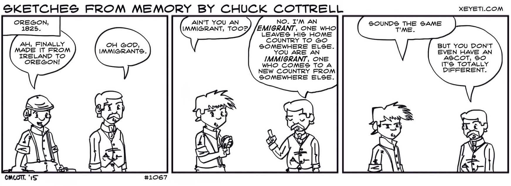 #1067 – Emigrant vs. Immigrant May 18, 2015 | xeyeti It’s odd that when an American moves somewhere, they are emigrants, not immigrants. Share this: Click to share on Tumblr (Opens in new window) Tumblr Click to share on X (Opens in new window) X Click to share on Facebook (Opens in new window) Facebook Like Loading... Related