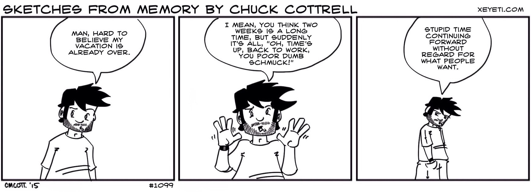 #1099 – Vacation No More July 3, 2015 | xeyeti I’ve said it before and I’ll say it again: curse you, linear progression of time! Share this: Click to share on Tumblr (Opens in new window) Tumblr Click to share on X (Opens in new window) X Click to share on Facebook (Opens in new window) Facebook Like Loading... Related