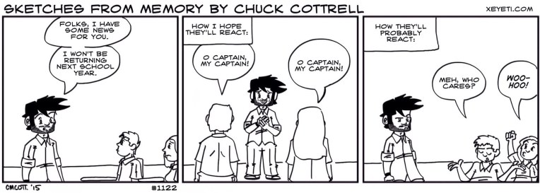 #1122 – Stand and Deliver August 4, 2015 | xeyeti I’ve taken a new job with the county public school system for the fall, so I have to bid farewell to the private school where I’ve taught for nine of the past ten years. It’s hard, but it’s a change I have to make. Share this: Click to share on Tumblr (Opens in new window) Tumblr Click to share on X (Opens in new window) X Click to share on Facebook (Opens in new window) Facebook Like Loading... Related