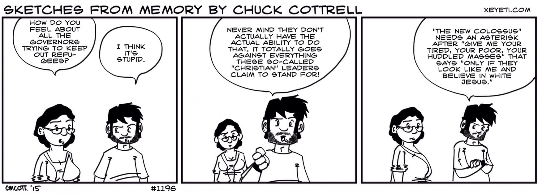 He whole situation makes me sick. We call ourselves a Christian nation, but let’s not take in refugees fleeing terrible atrocities. Never mind the erroneous propaganda they’re spewing, talking about “200,000 refugees” (the number is closer to 10,000).