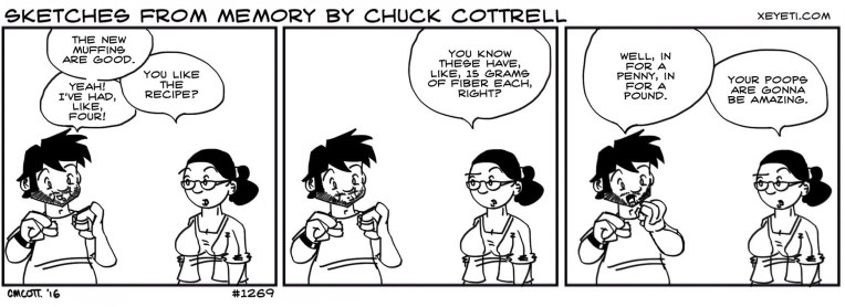 The low-carb diet the Wife is doing involves the creation of lots of things using non-traditional flours (made of cocoanut and almond and stuff), and lots of things with this substance called flax seed. The upshot is there is way more fiber in my diet. The poops have been, in fact, amazing.