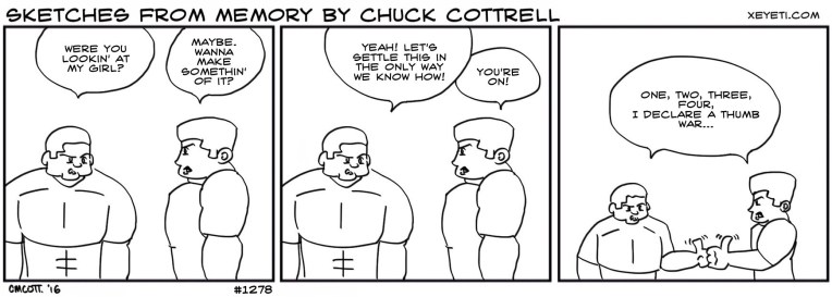 #1278 – Violence Solves Everything March 9, 2016 | xeyeti Meatheads solving problems in meathead ways. Bam! Share this: Click to share on Tumblr (Opens in new window) Tumblr Click to share on X (Opens in new window) X Click to share on Facebook (Opens in new window) Facebook Like Loading... Related