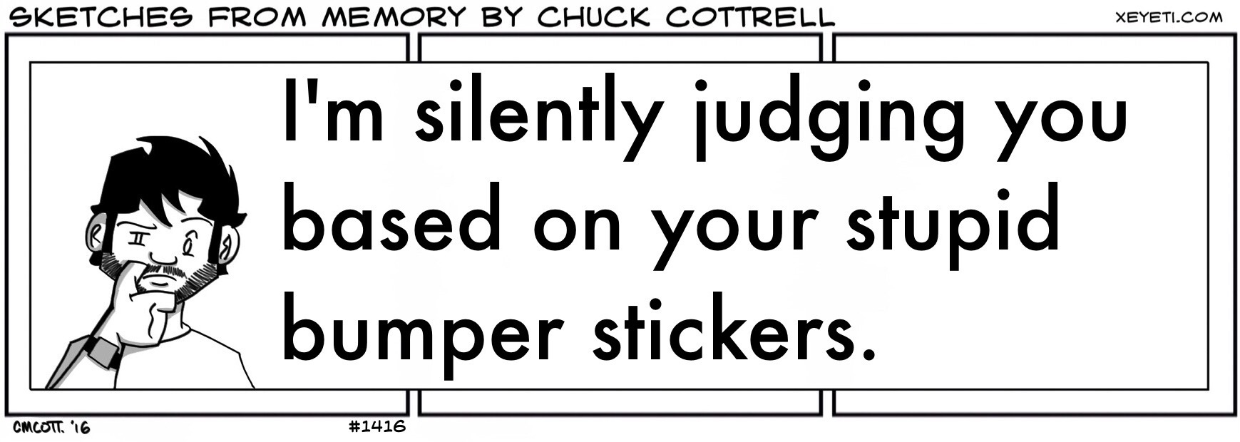 #1416 – Bumper Sticker September 18, 2016 | xeyeti Yes, even that one. Especially that one. Share this: Click to share on Tumblr (Opens in new window) Tumblr Click to share on X (Opens in new window) X Click to share on Facebook (Opens in new window) Facebook Like Loading... Related