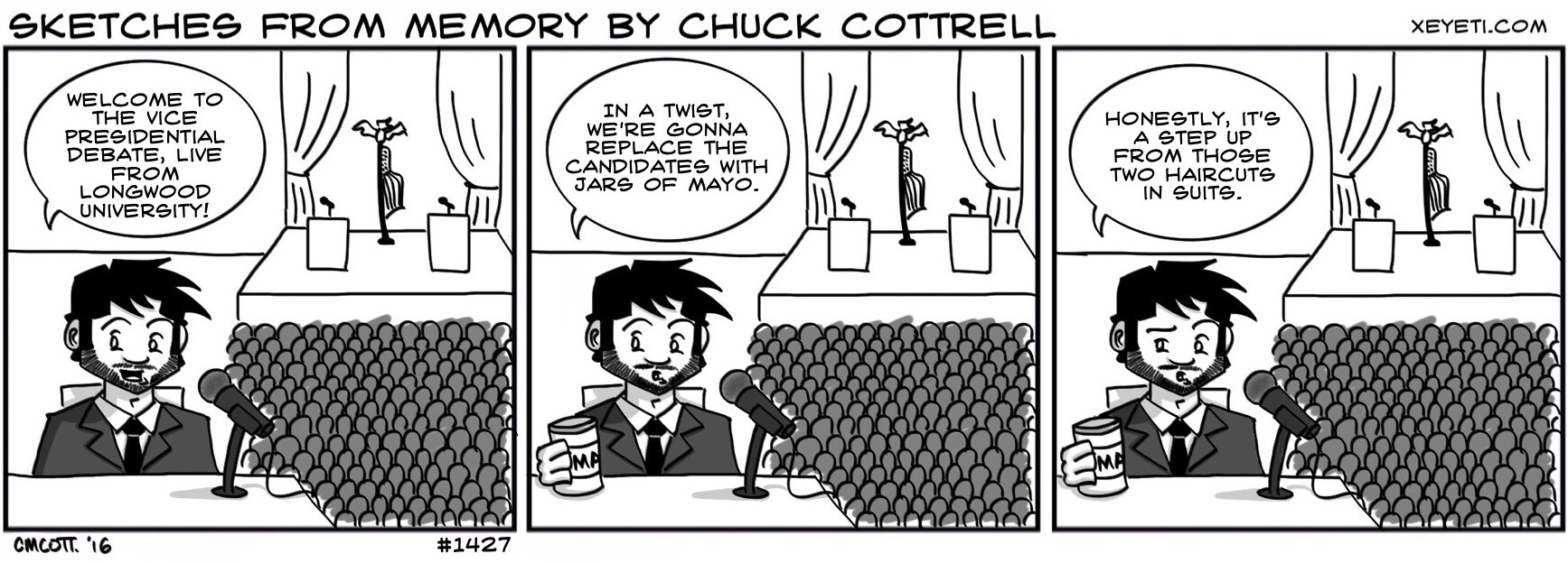 #1427 – VP Debate 2016 October 3, 2016 | xeyeti The debate between Pence and Kaine is gonna be…um…a thing that occurs. Yes. Share this: Click to share on Tumblr (Opens in new window) Tumblr Click to share on X (Opens in new window) X Click to share on Facebook (Opens in new window) Facebook Like Loading... Related