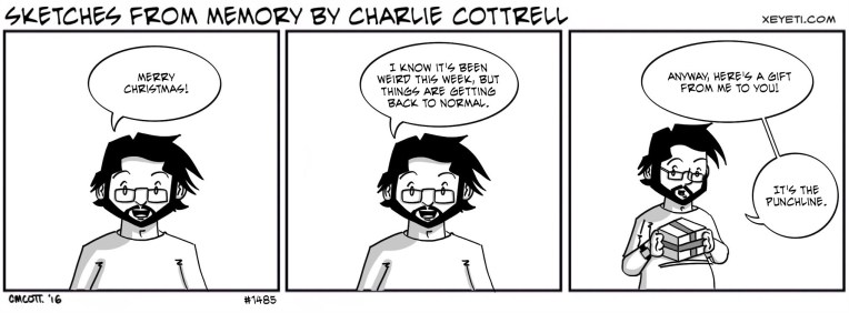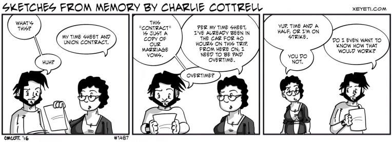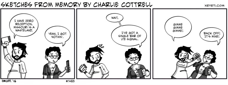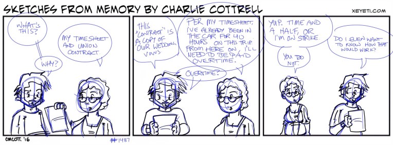 As you can see, the comic isn’t quite done, and it’s late and I still have miles to drive tomorrow. So, here’s the rough draft – the blue “pencil” layer – and my basic inks. Still have to fill in the hair and do the shading and all that, add the real dialogue bubbles and text, but at least I don’t leave you hanging like last week. I’ll finish this when I get home in the evening and upload the final product.