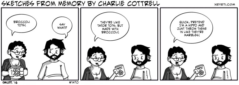#1470 – Hungry, Hungry Hippos December 2, 2016 | xeyeti Another of those “ripped from our text messages” comics. She quite enjoyed the broccoli tots, apparently. Share this: Click to share on Tumblr (Opens in new window) Tumblr Click to share on X (Opens in new window) X Click to share on Facebook (Opens in new window) Facebook Like Loading... Related