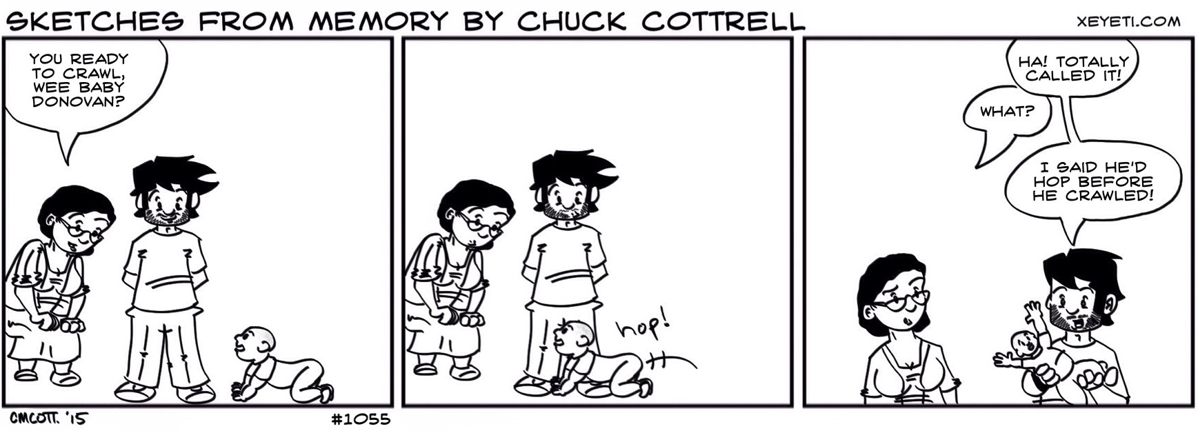 #1055 – Hopper May 3, 2015 | xeyeti We babysat the nephew Sunday afternoon. He does, indeed, hop a bit instead of crawl. He also enjoys it when you try to eat his spine. I dunno, babies are weird.