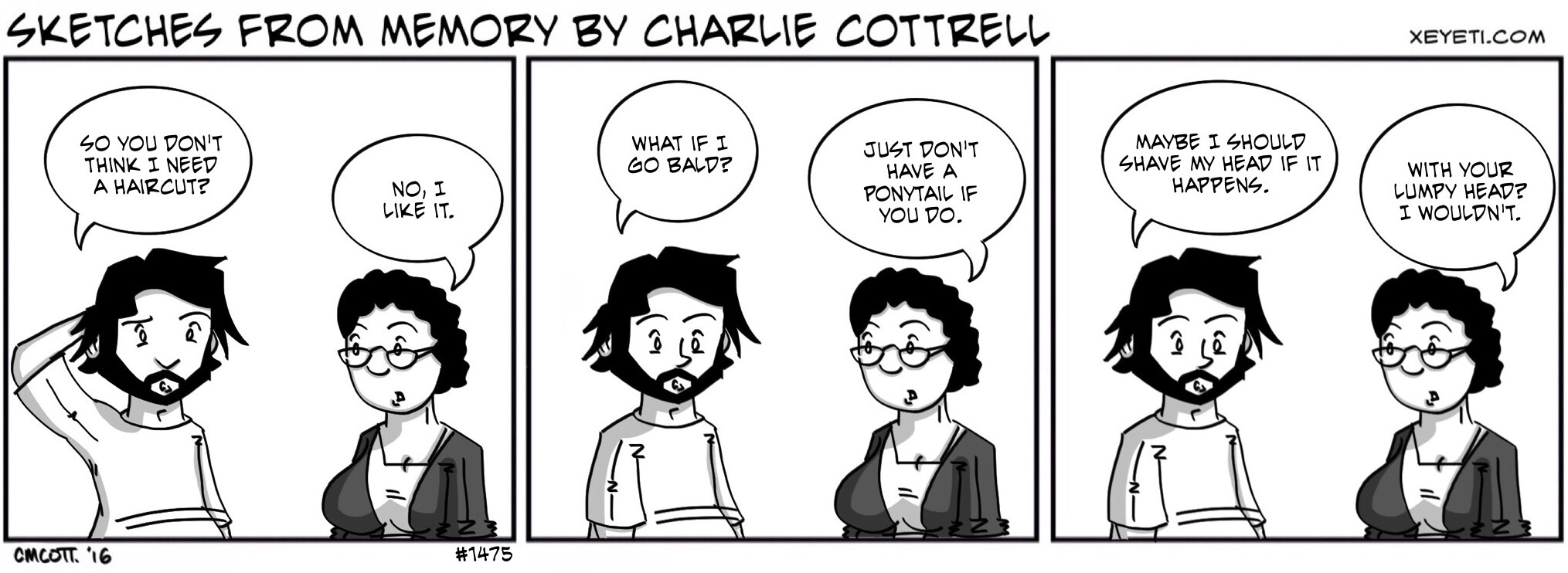 #1475 – Lump December 9, 2016 | xeyeti Is there anything sadder than a balding man with a ponytail? I don’t think there is. Though my head is really damn lumpy, guys.