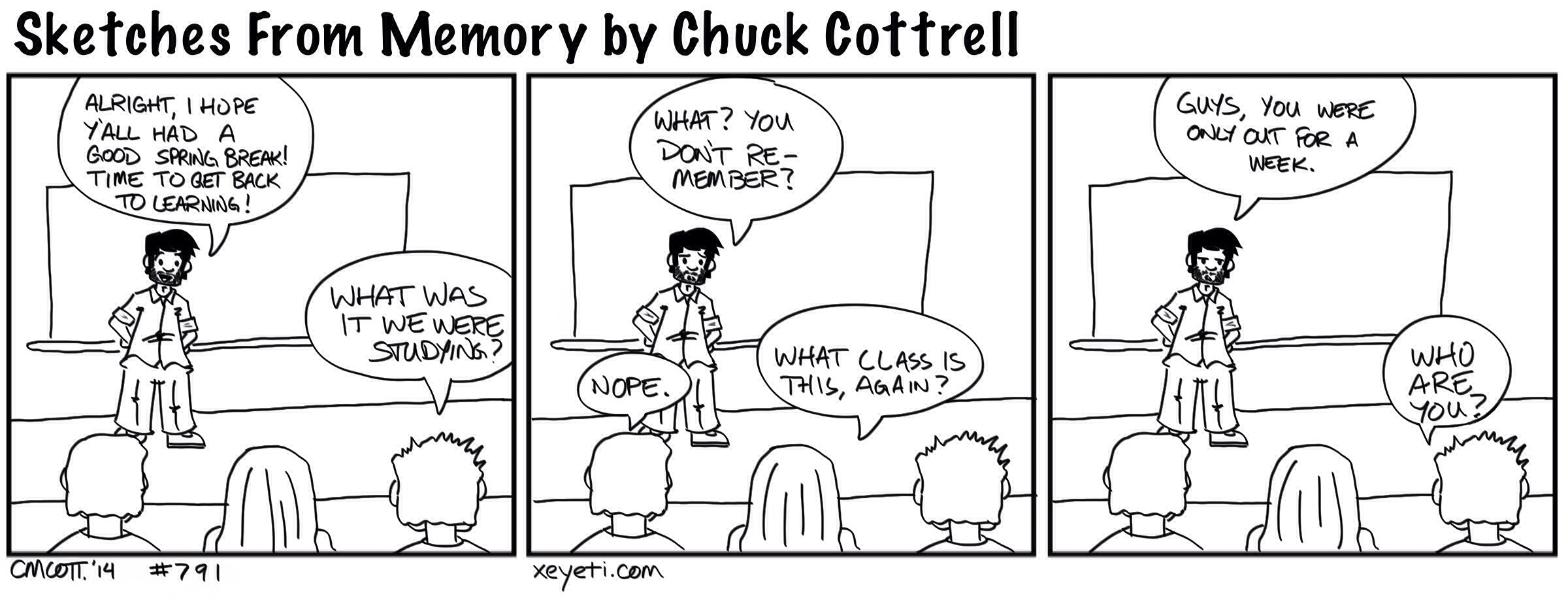 #791 – Post-Break Blues April 20, 2014April 20, 2014 | xeyeti It’s like this after every break, regardless of length. Three-day weekends have this effect. Regular weekends have this effect.