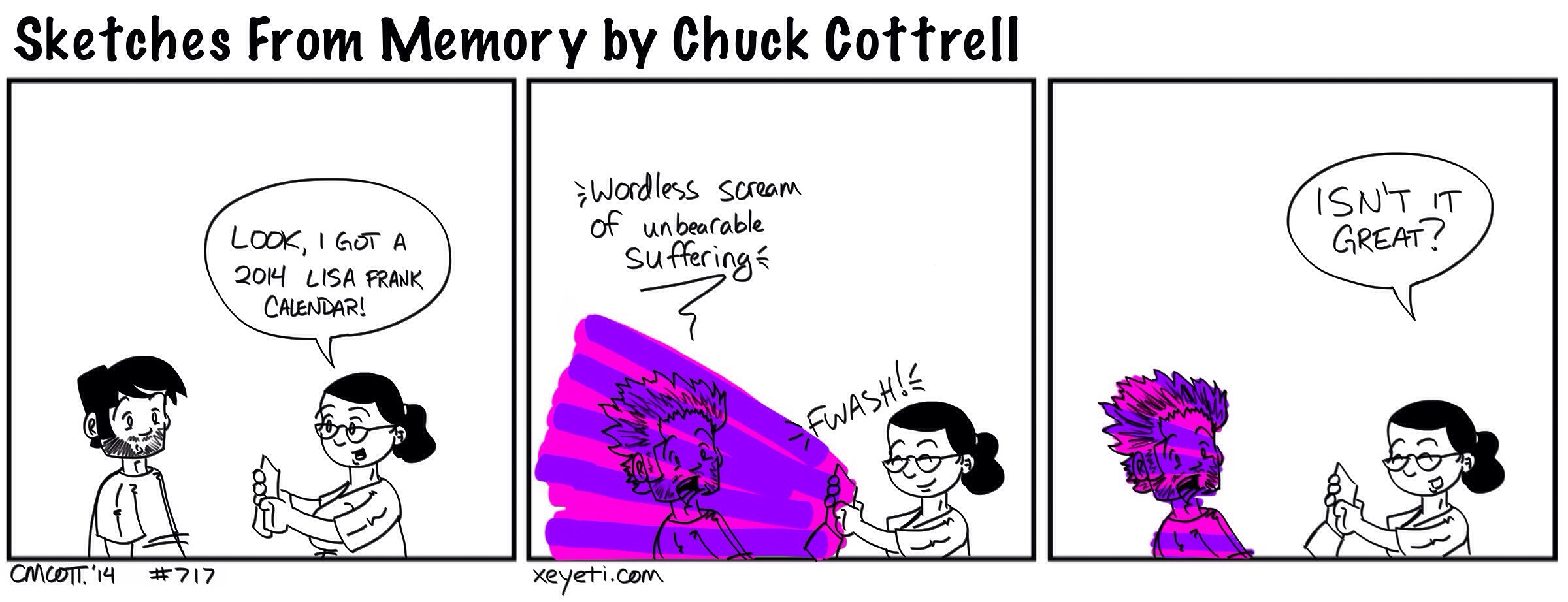 #717 – Calendar Year January 2, 2014January 1, 2014 | xeyeti For Christmas, the Wife got a Lisa Frank calendar. It’s the stuff of childhood technicolor dreams, really, all pinks and purples and tap dancing unicorns. I am more than a little disturbed by it.