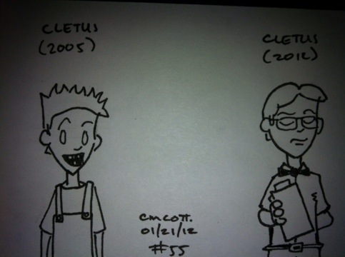 Today’s sketch is a model comparison for Cletus, the pint-sized hillbilly genius. Cletus was featured in two or three big storylines back in the day (including one where I totally snarked on the old Hatfield/McCoy feud), and he was always a fun character to write (a weird mix of country bumpkin and nerd). For the remake that fell apart, I decided to let him grow up (since it was supposed to be five years later) and ditch the overalls, fully embracing his nerdiness. He would’ve been Jerome’s personal assistant, a thankless task at best.