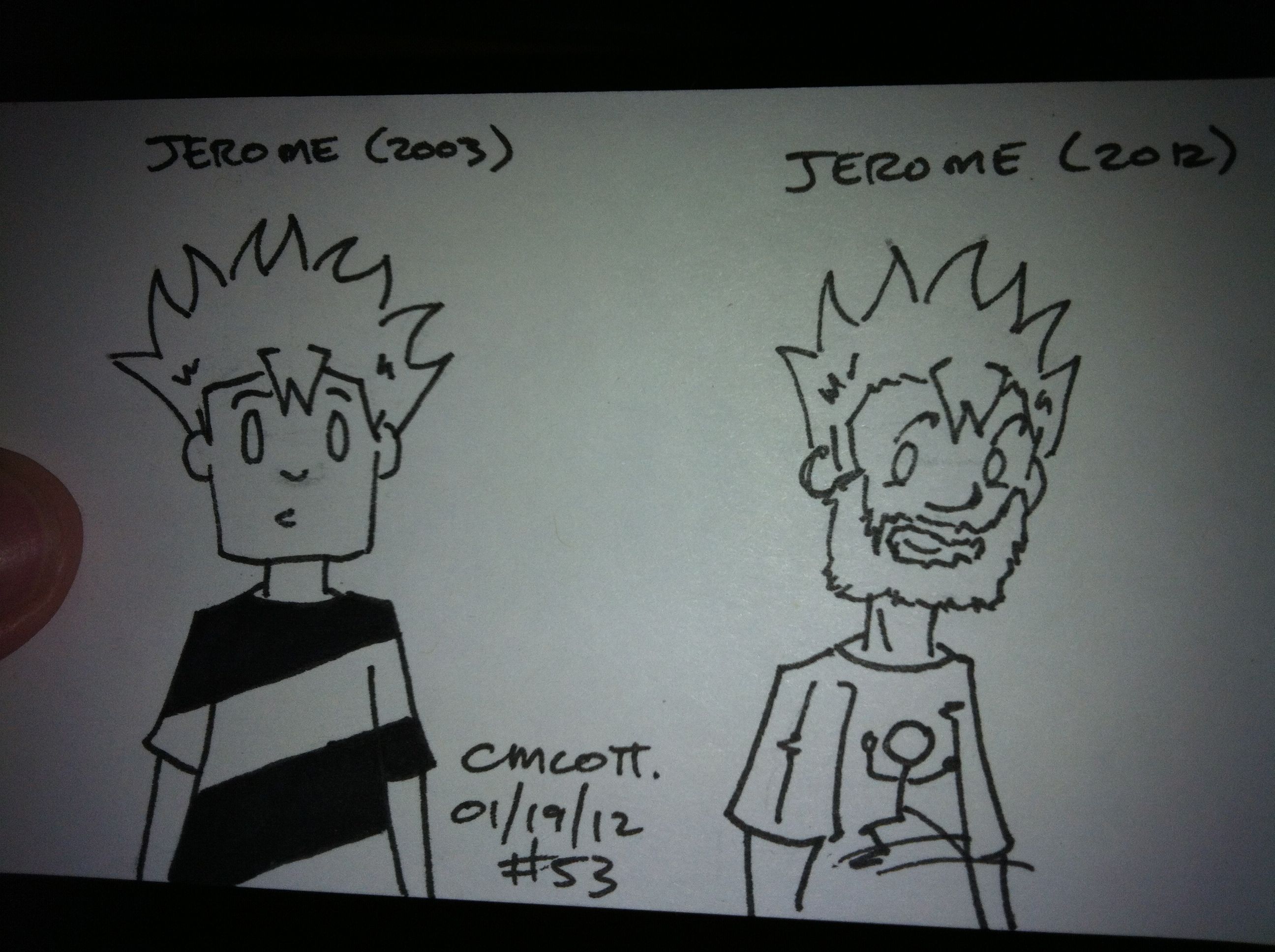It’s later than I’d like, but here’s today’s sketch. In keeping with my theme, I’ve done a model comparison of Jerome. As usual, there is something I like about the classic, original model, which has very clean lines and a t-shirt that was always striped the exact same way regardless of what direction Jerome faced. He was tricky to re-imagine, though, because I really wasn’t sure how to give him a distinctive hairstyle and look that would harken back to the original but still show progression. The hair stayed basically the same, though I’ve added a bit more detail to it, and the beard made sense considering he started growing facial hair of various designs in a couple of storylines from the old comic (the Pirate Choir and the Lazy Summer, specifically). I also decided to give him a new shirt (in the planned-but-abandoned Crooked Halo 2.0, he’d have gone on to become a game designer who’d made lots of money creating some game for smartphones, and the shirt would’ve been either his company logo or the main character from his game).