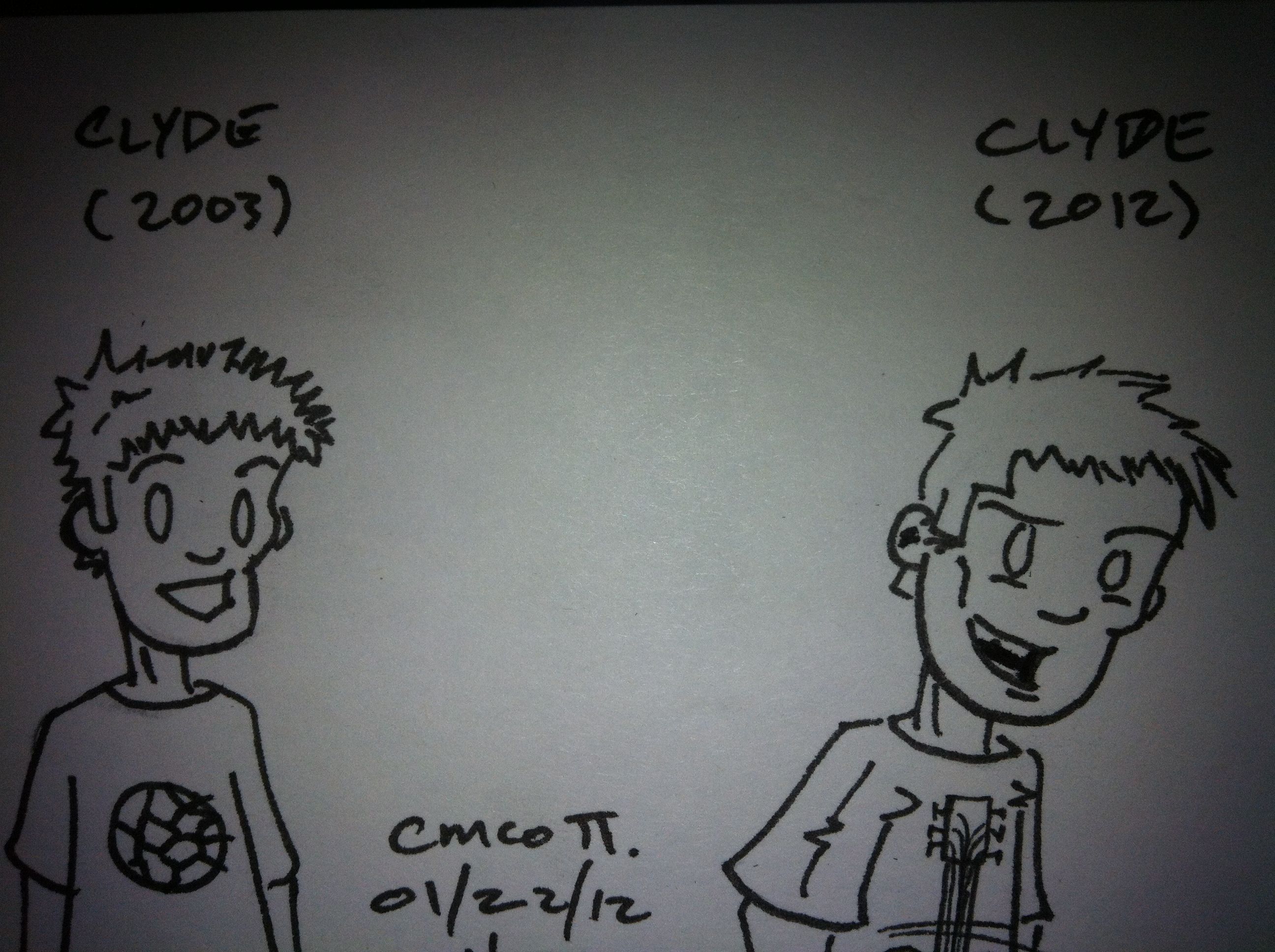 Today wraps up the week of Crooked Halo model comparisons with a look at Clyde. Clyde is based on my brother, Clif, whose nickname in high school was Clyde (so, y’know, only loosely based). I’ve never been particularly happy with Clyde’s character design (the early design made him look hydro-cephalic, and I’m not sure the new design works much better), though it’s getting closer to something I can at least tolerate. I hadn’t really come up with many plans for his use in the reboot yet, though I did know at least that he and Simon would still be working on music even though they were living in different parts of the country (just as my brother and I do).