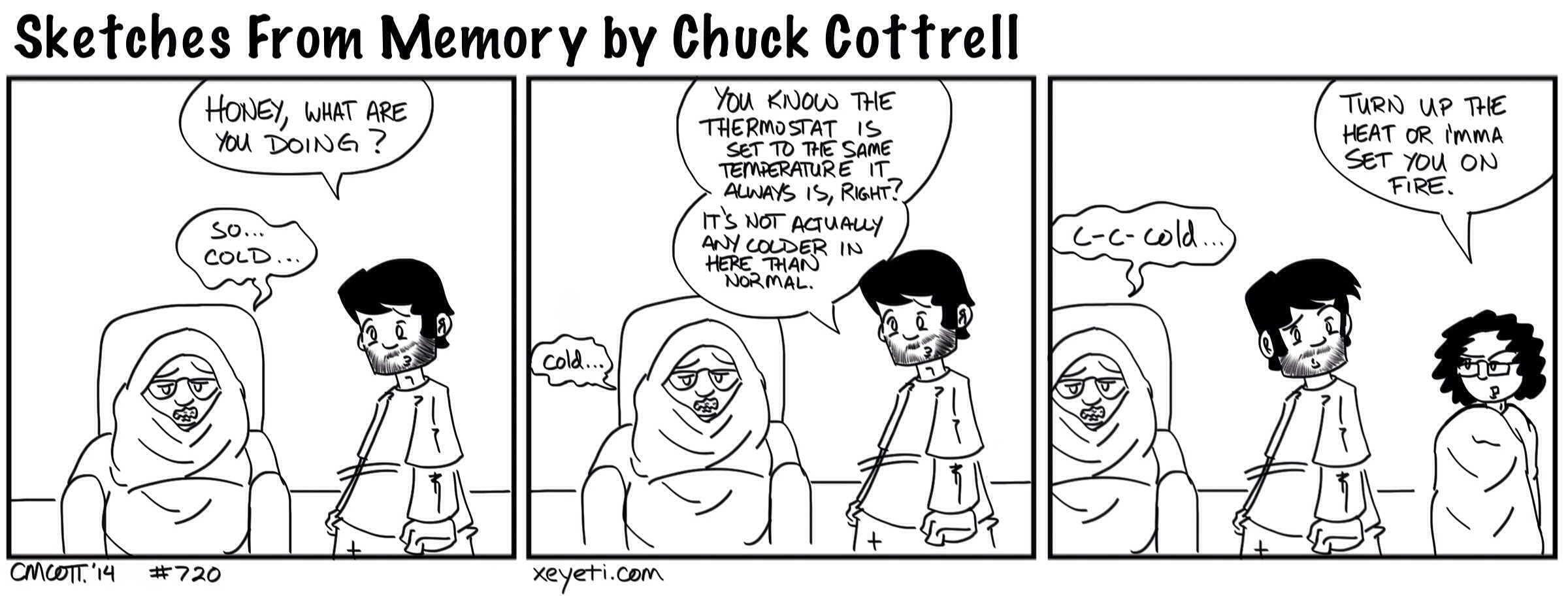 #720 – Polar Vortex January 7, 2014January 6, 2014 | xeyeti Just cashing in on the “holy crap it’s cold” thing. They cancelled school Tuesday due to ludicrously low temperatures, apparently.