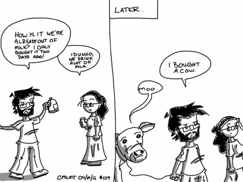 Sketch a Day, Day 129 April 4, 2012September 26, 2012 | xeyeti Milk goes remarkably fast in my household. My wife and her sisters are both very fond of milk as a beverage, to the point that there is rarely any left for me to use on cereal. Cest la vie, or however the French spell that.