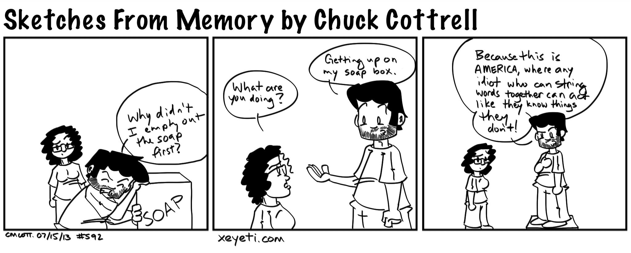 I don’t know if the comic carries the message quite as clearly as I wanted. Don’t get me wrong, I think First Amendment freedoms – especially freedom of speech – are the most important freedoms we have (yes, even more important than yer right t’guns), and everyone should have the opportunity to speak their mind on things.