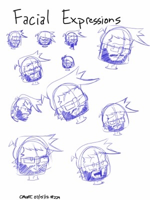 After checking out a new follower’s site earlier today, I decided it might be fun to do some facial expressions. I love cartooning, because I can create a variety of very clear expressions and emotions with very few lines. I find the eyebrows and mouth especially useful for conveying a character’s inner feelings.