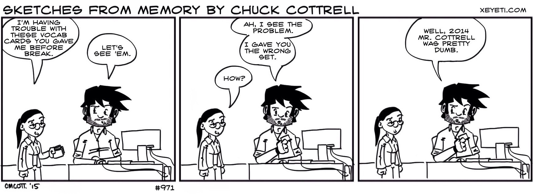 #971 – Past Me Was Not Always On Top Of Things January 6, 2015 | xeyeti 2015 Mr. Cottrell isn’t always that swift, either. Buy the damn book already, huh?