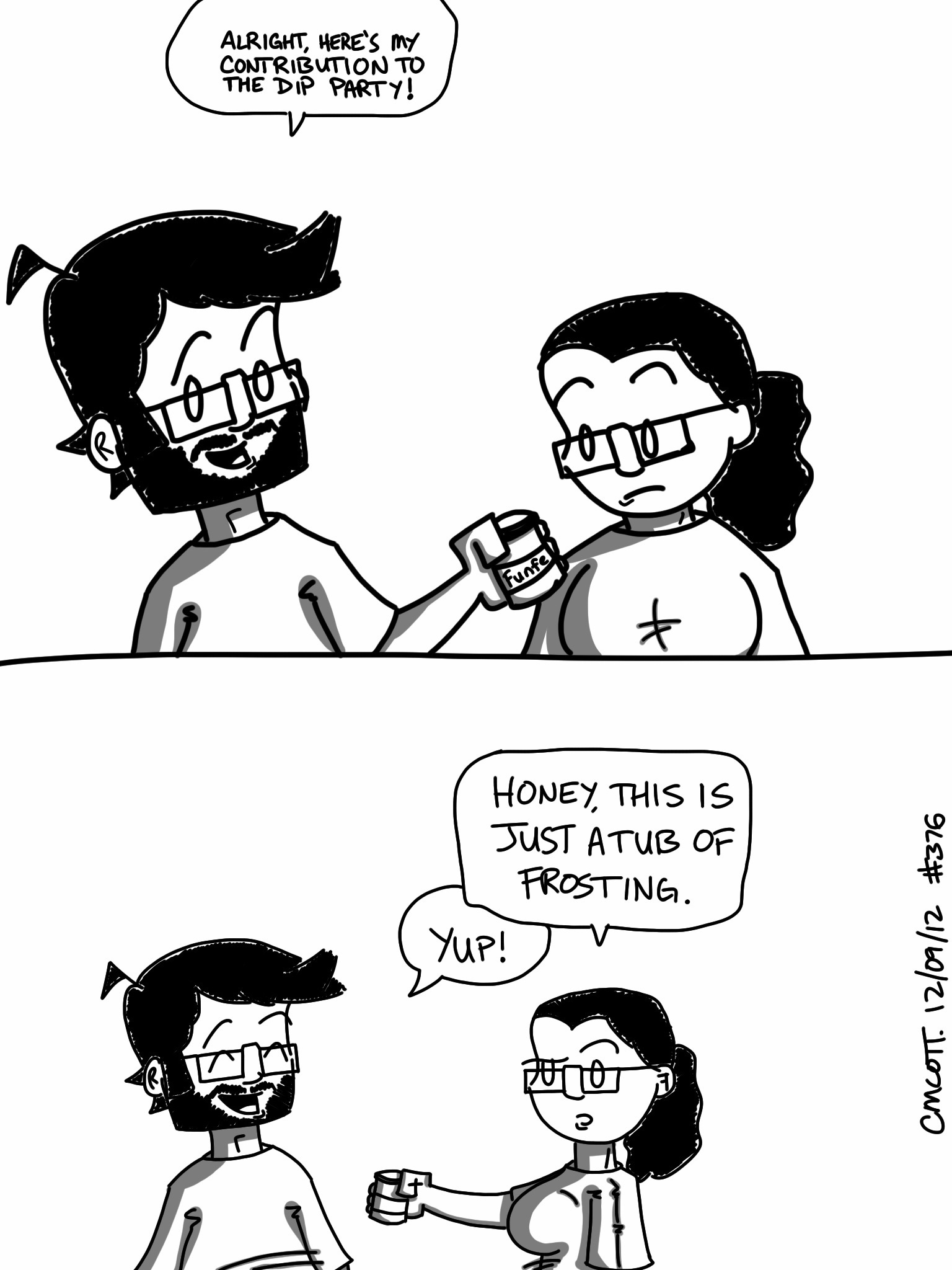 Sketch a Day, Day 376 December 9, 2012December 9, 2012 | xeyeti We hosted a dip party last night. Everyone brought some sort of dip. It was fantastic. My wife didn’t particularly care for my contribution.