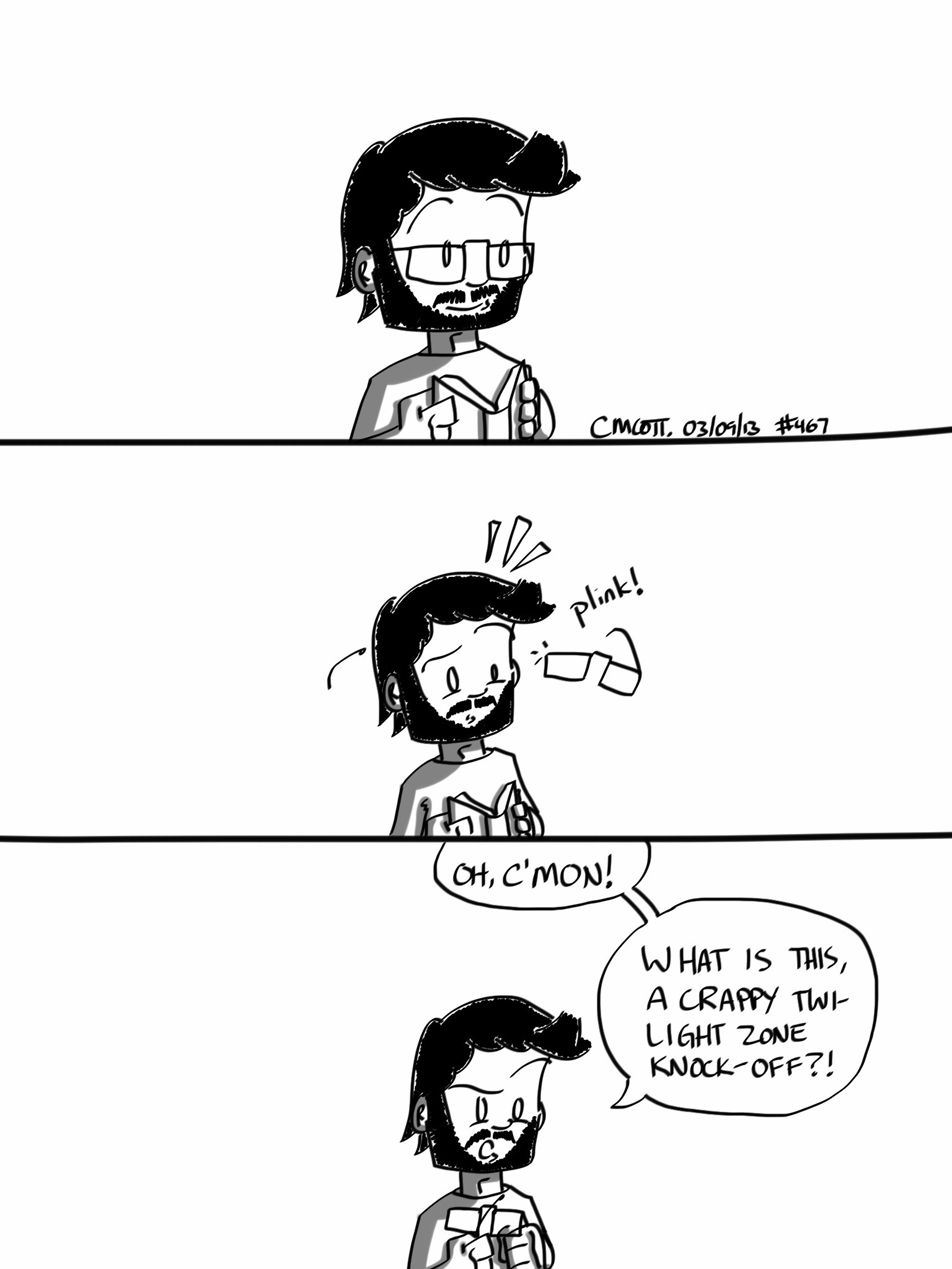 Sketch a Day, Day 467 March 9, 2013March 9, 2013 | xeyeti My glasses broke this evening. I wasn’t doing anything strenuous or anything; I mean, unless you count playing Mass Effect.