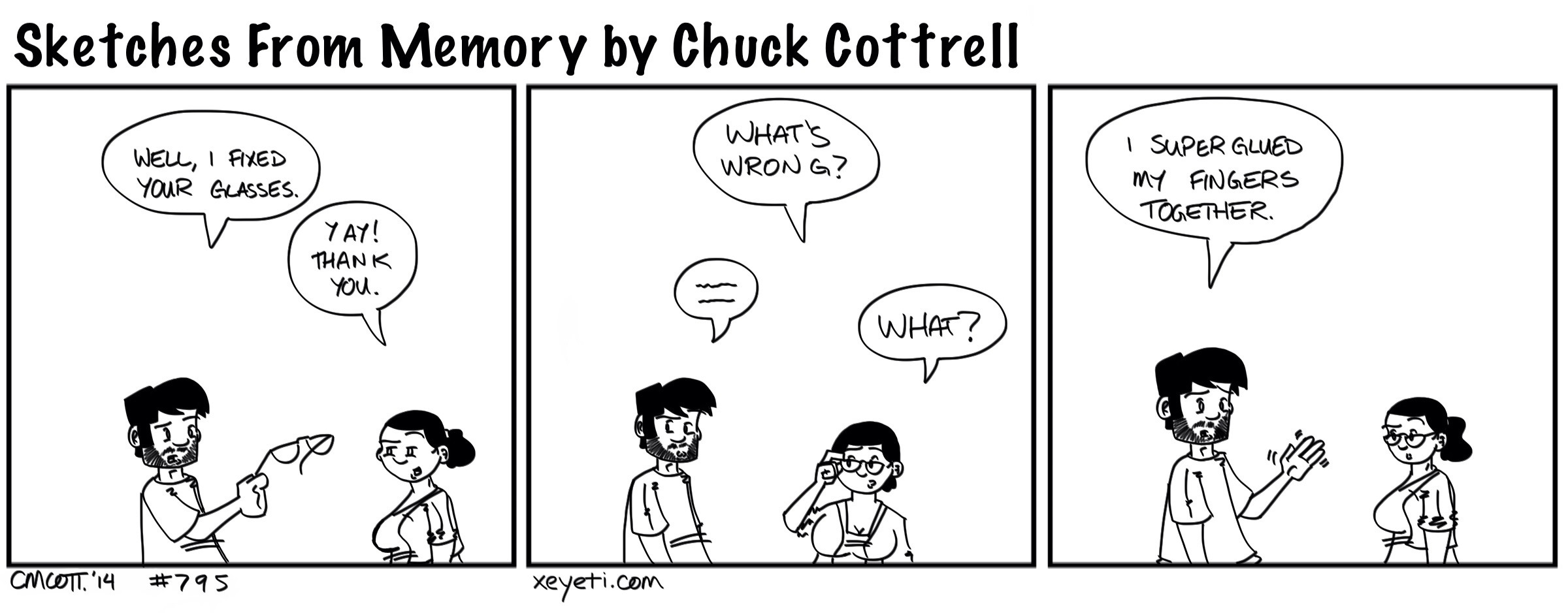 #795 – Superglue April 24, 2014 | xeyeti My wife’s glasses broke over the weekend. I fixed them, but then they broke again today. Again, we fixed them with superglue. And managed to glue my fingers together. Yup.