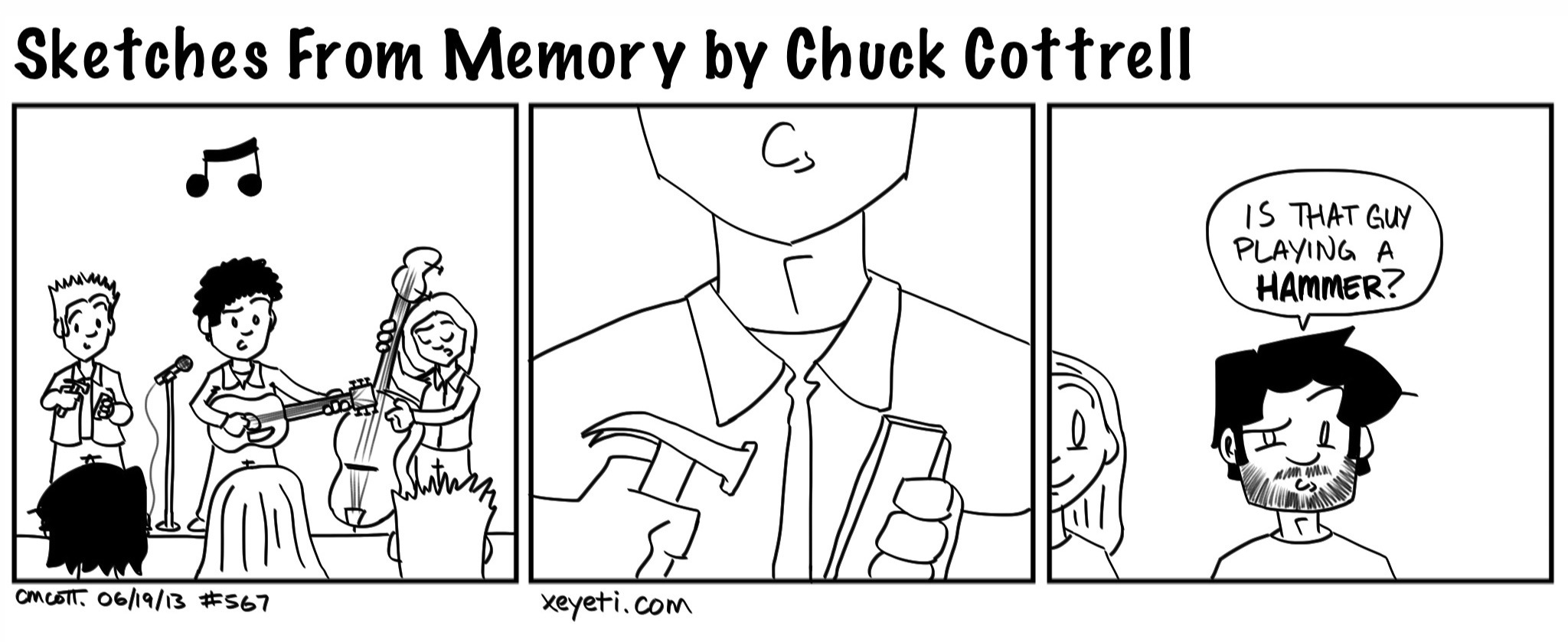 Sketch a Day, Day 567 June 19, 2013June 19, 2013 | xeyeti Went to a show tonight where the opening act had a percussionist who totally played a hammer in the first song. It was a little surreal.