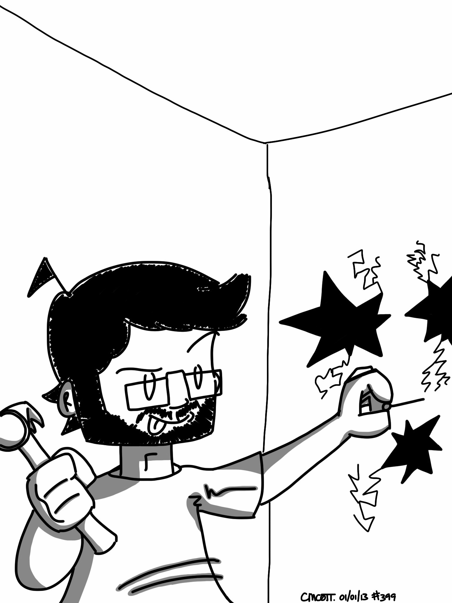 Sketch a Day, Day 399 January 1, 2013January 1, 2013 | xeyeti It’s my last day of Winter Break, which is sad. I spent some time this evening putting up,a floating shelf in the kitchen for my wife. It…was difficult, to say the least, but the damn thing is up.
