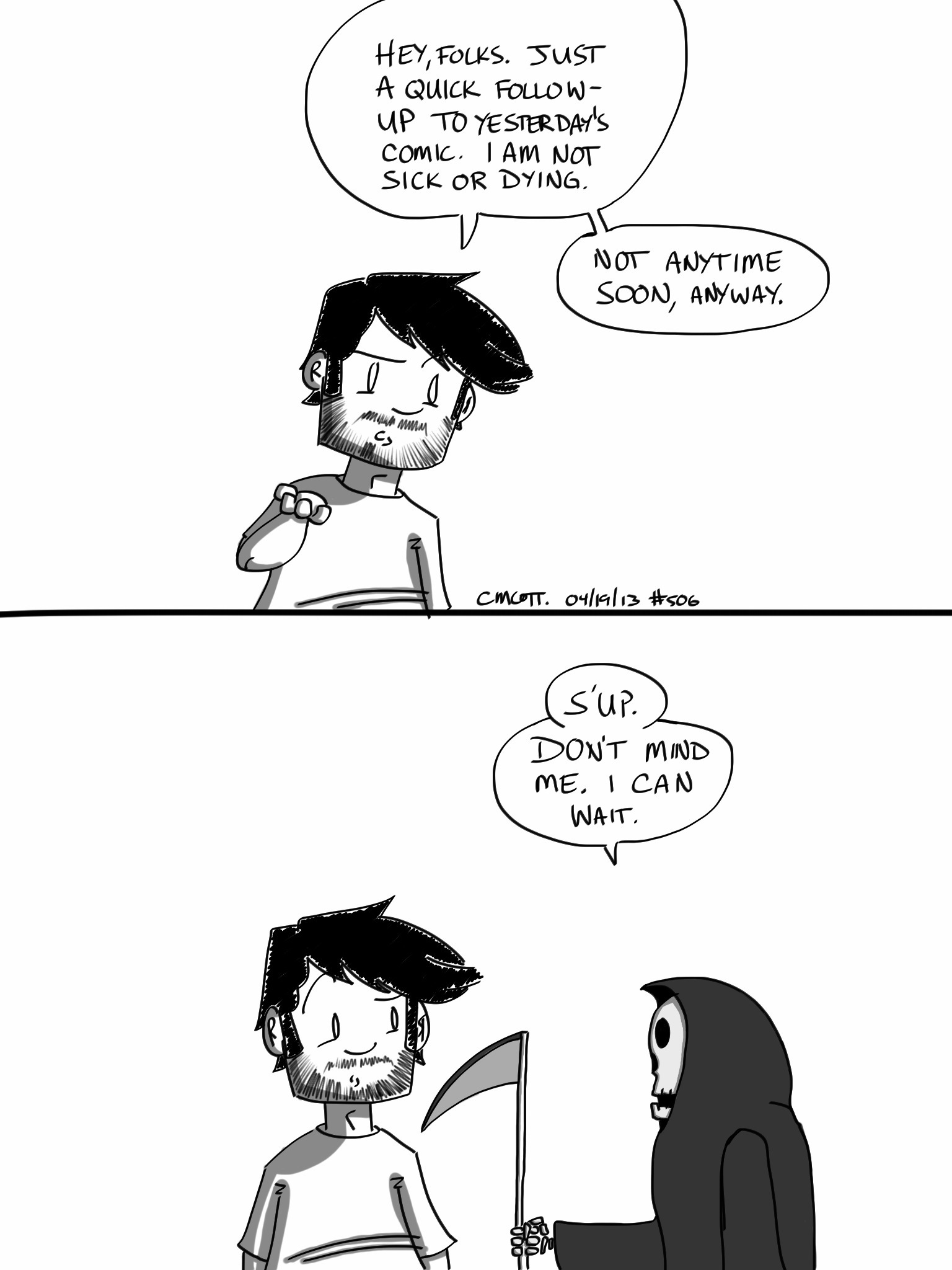 Sketch a Day, Day 506 April 19, 2013 | xeyeti Let’s just lay to rest the rumors from last night’s comic: I am not dying. I’m not even sick. If anything, I’m actually getting healthier because I’ve started exercising again. Honest.