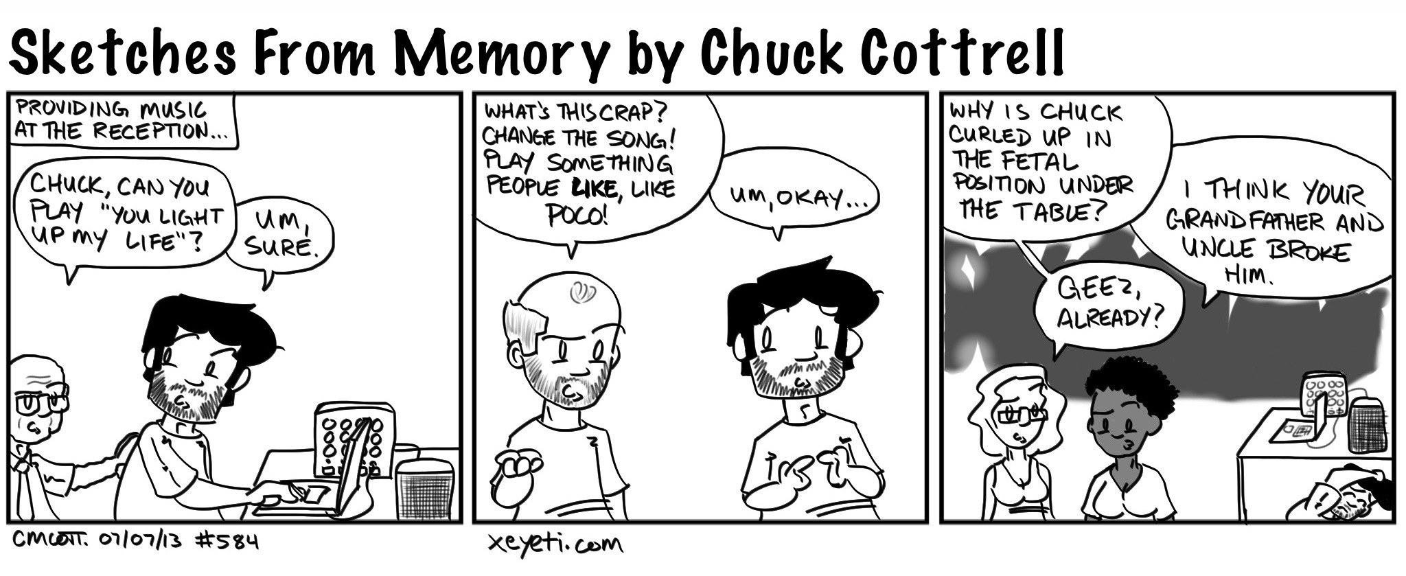 I apologize for the sudden radio silence. With my sister-in-law’s wedding and reception this weekend, we were suddenly invaded by a horde of Brancos. They all came over to my house Friday night for dinner, and then we had the actual reception Saturday night. At meant two very long, very exhausting days in a row where I just couldn’t get anything drawn, I should’ve able to get back on track now, though.