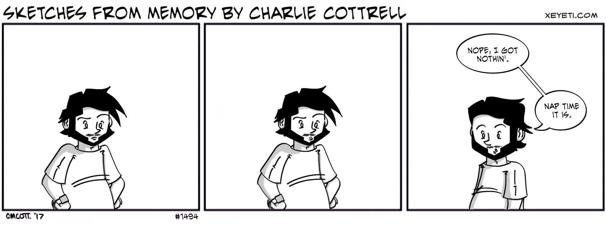 #1494 – Nothin’ January 5, 2017 | xeyeti Some days, you just seem empty of ideas. This is one of them. On the other hand, naps are good.