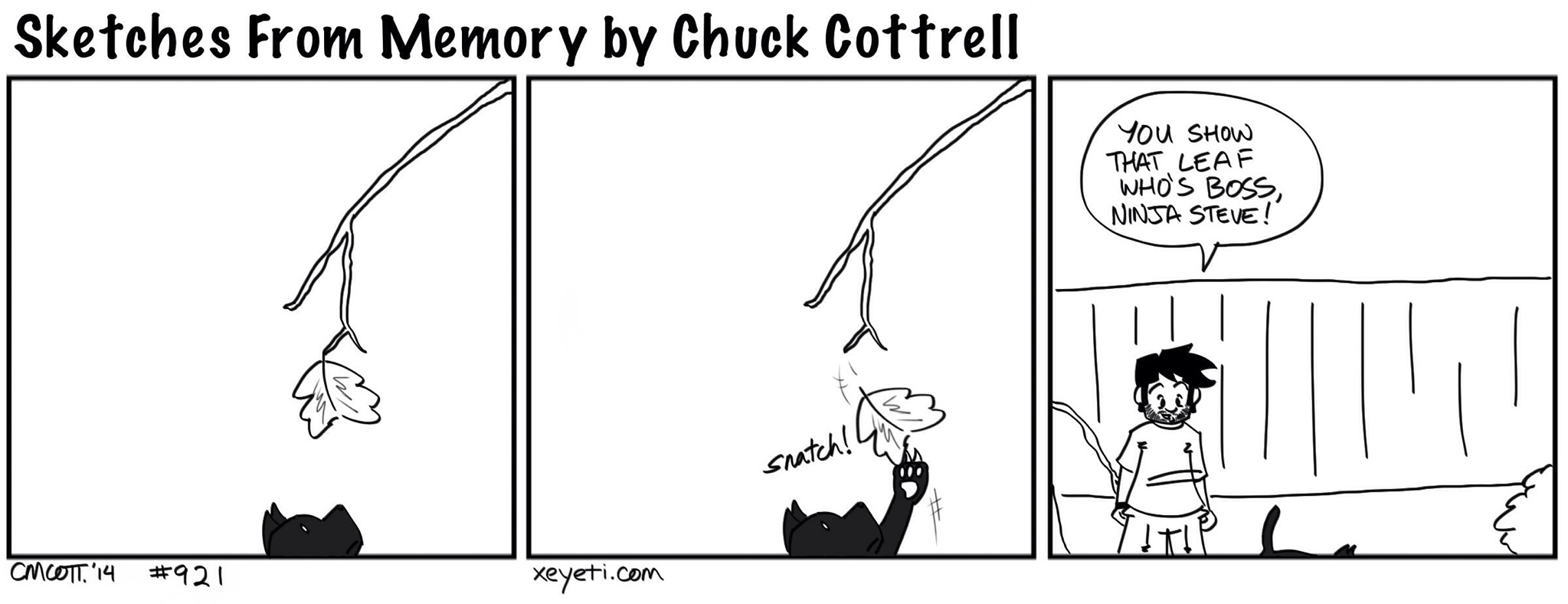 Today’s sketch includes two things I’m fond of: the return of my chibi art style (not really all that different from my usual style, just more…compressed, I guess) and an appearance by the cutest, dumbest cat in the world, Ninja Steve. Ninja Steve (and her sister, Cecilia) is a rescue cat my wife and I picked up four years ago. The two cats were barely six weeks old and suffering from a number of fungal infections (they were feral cats that had been humanely trapped so they could be put up for adoption), but they were tremendously cute and we got the pair of them. Today, they’re not really all that big; Ninja Steve tops out at around 7 pounds, while Cecilia is a svelte 5. And they have very distinct personalities: Cecilia is definitely the Alpha of the two, does not like to be picked up, but needs constant attention and love. She’s also the more playful of the two. Ninja Steve, on the other hand, loves nothing more than to lay across my shoulder. Or on the back of the couch. Or on a pillow. Or in a sunbeam. Honestly, that cat only ever really moves with any sort of speed when we put food in their bowl. Ninja Steve is pretty chill, except when that bowl is empty. Then, there’s no consoling her.