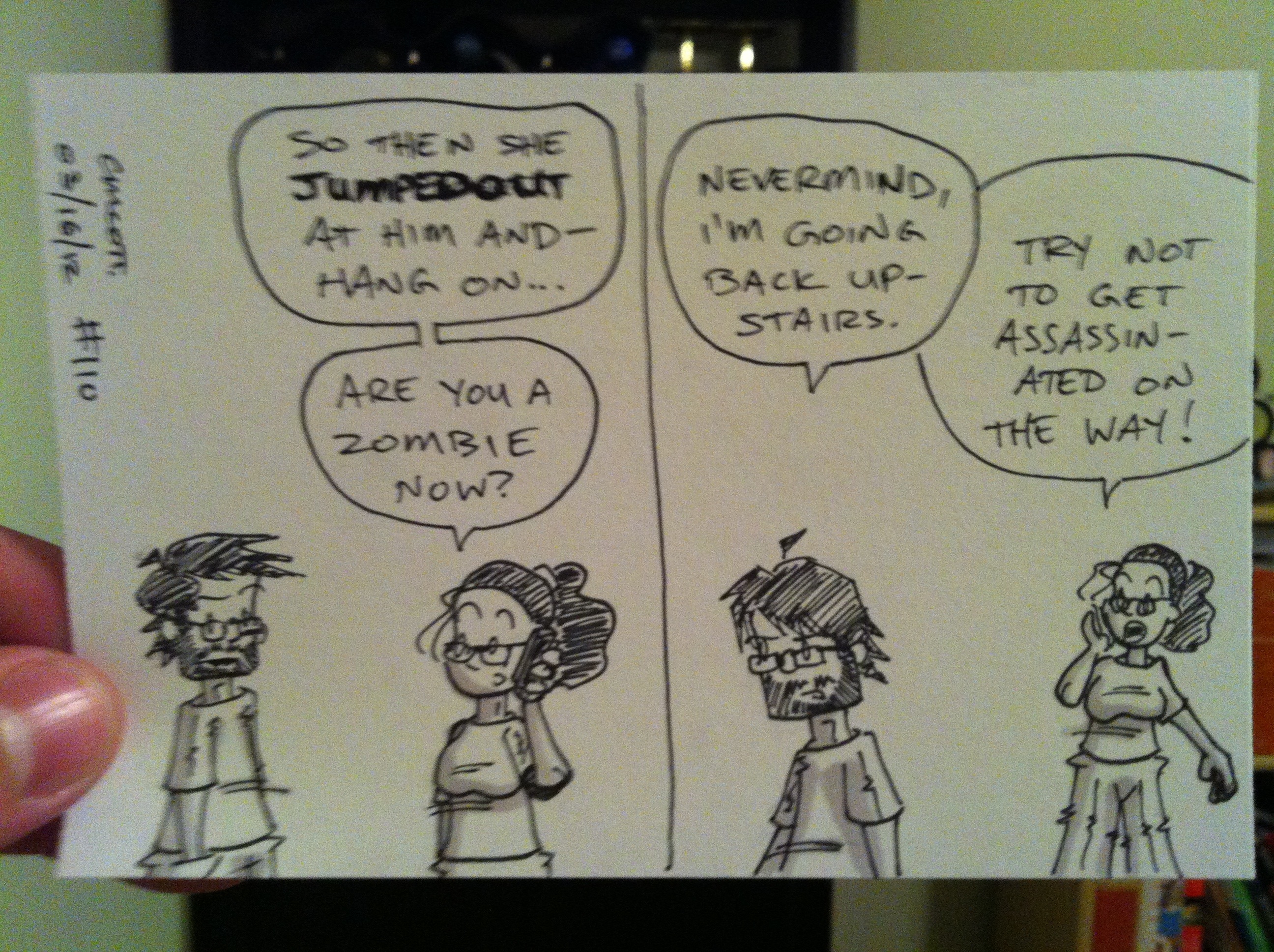 Sketch a Day, Day 342 November 5, 2012November 5, 2012 | xeyeti Coming back from the dead? Surprisingly easy. Coming back and not being killed by zombie-obsessed sister-in-law? Hard.
