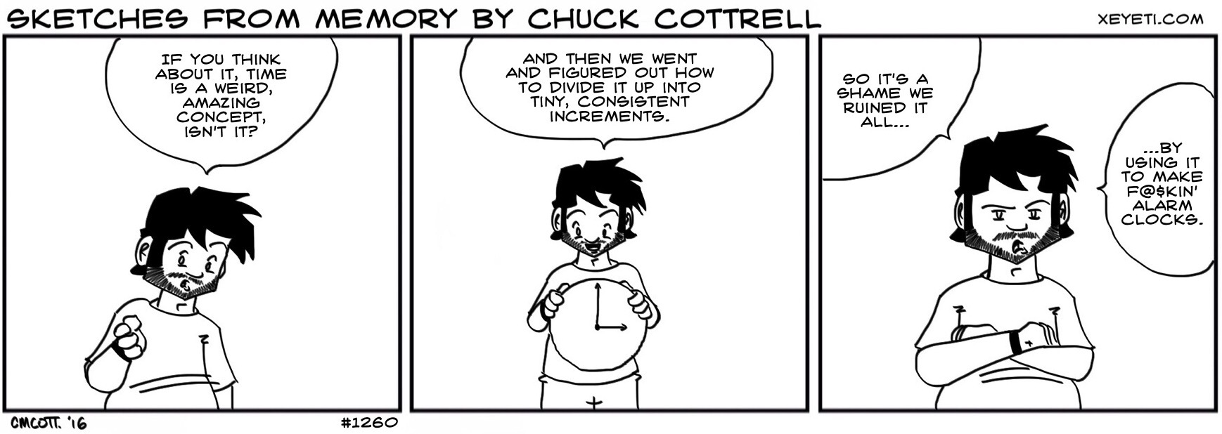 #634 – A Wrinkle in Time September 8, 2013September 8, 2013 | xeyeti This is really only a problem on the weekends. During the week, time never seems to move fast enough.
