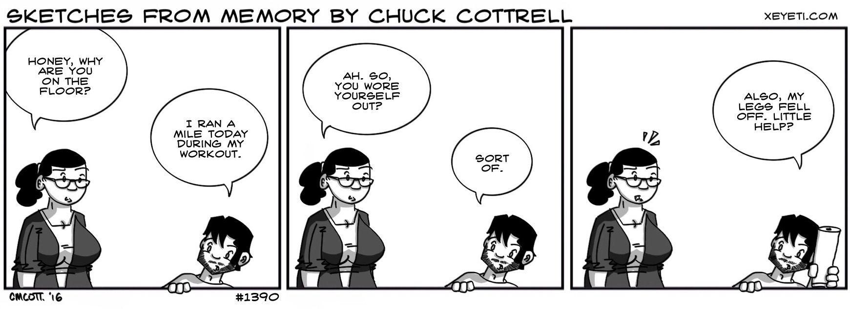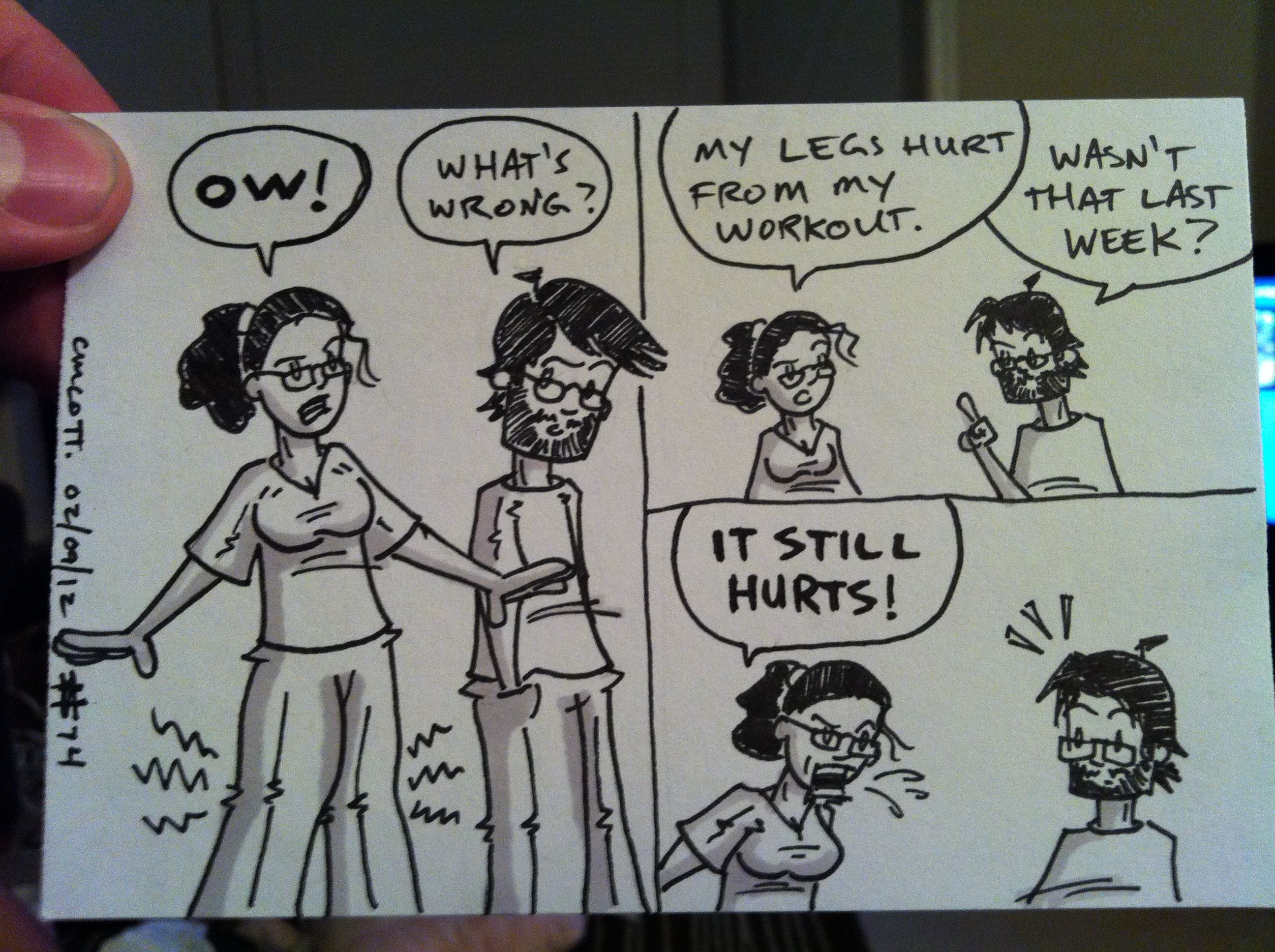 We’ve all been working out in this household, by which I mean myself, my wife, and my two sisters-in-law. My wife’s been doing things with something called a kettlebell, which I’d sure as hell never heard of, but apparently it’s quite strenuous. Even now, four days after the fact, she complains of the pain in her legs.